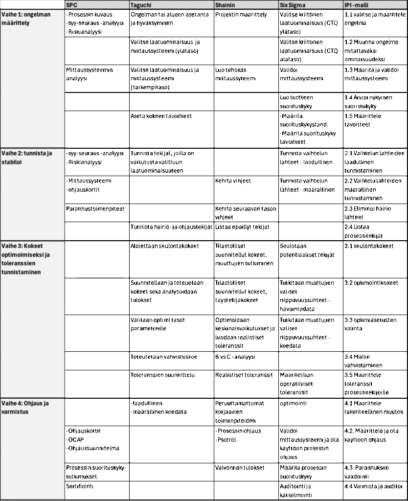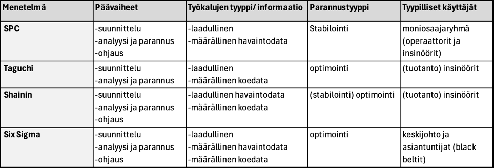 Taulukon 1 toisessa sarakkeessa on lueteltu kunkin menetelmän päävaiheet. Edellä mainitun päällekkäisyyden lisäksi voidaan havaita myös eroja, erityisesti analyysiin ja parantamiseen liittyvien toimintojen osalta.