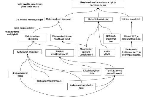 Tarpeen mukaan tavoitepuita voidaan tehdä organisaation eri tasoille, tärkeintä on kuitenkin pitää mielessä ylimmän tason tavoite. Hierarkkisesti tilanne on seuraavan kuvan mukainen, ylimmän tason yksittäinen välttämätön edellytys onkin seuraavalla tasolla tavoite. Kuvassa 5 esimerkiksi ”Synkronoitu tuotanto esteen ja kysynnän mukaan” onkin tuotanto-osaston tavoite.