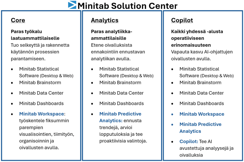 Tarjoaa työkalut datan käsittelyyn, analysointiin ja projektinhallintaan Minitab Workspace ‑kokonaisuuden ansiosta. - Minitab Solution Center Analytics – analytiikan ammattilaisille