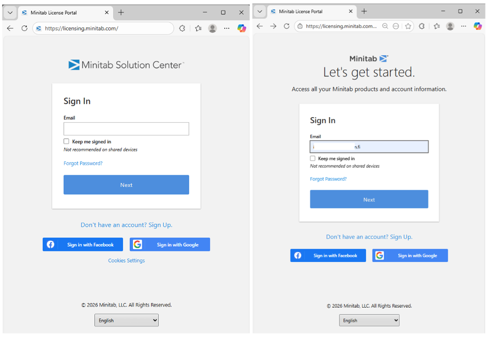 - Syötä sähköpostiosoite, joka on liitetty Minitab-lisenssiisi. Valitse Next.