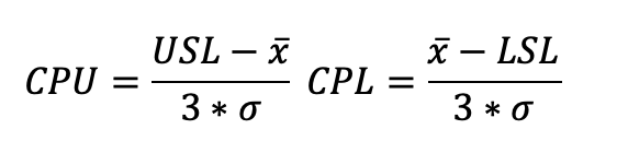 Parit CPL/CPU ja PPL/PPU kuvaavat hajonnan leveyttä (3*keskihajonta) keskiarvon ja alemman (Lower) tai ylemmän (Upper) vaatimuksen välissä. Eli käytännössä kuinka kaukana speksistä ollaan. Jos keskiarvo on jollain tavalla sivussa, tulee toisesta arvoista yleensä todella hyvä ja toisesta huono, jolloin näistä otetaan huonompi ja saadaan Cpk tai Ppk arvo.